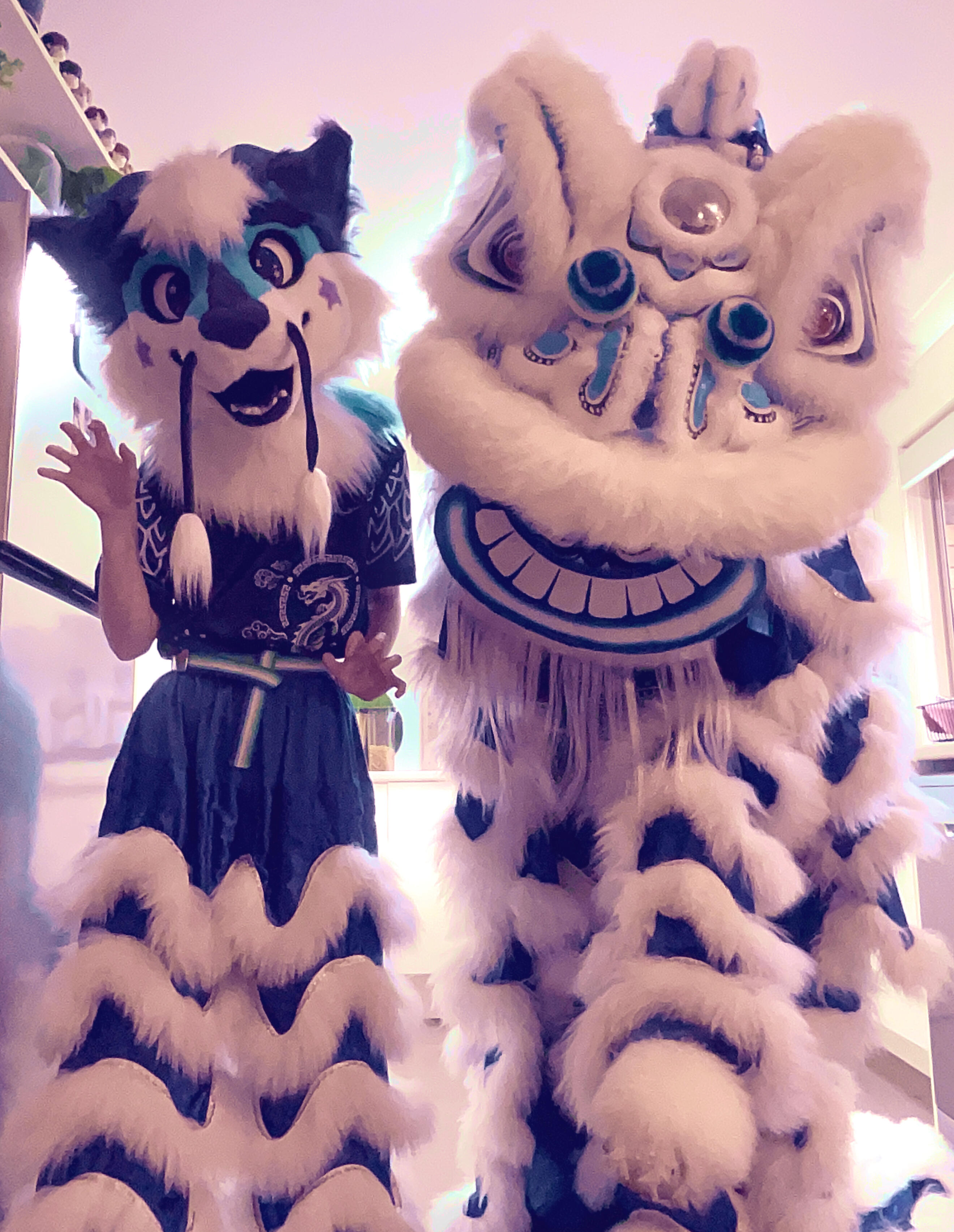 ★ Kai is a Modern Hoksan/Heshan lion, he has a beautiful blue satin coat with white fur! He'll bring the vibes and dance moves to any event, hes playful, cheeky and a gentle spirit.